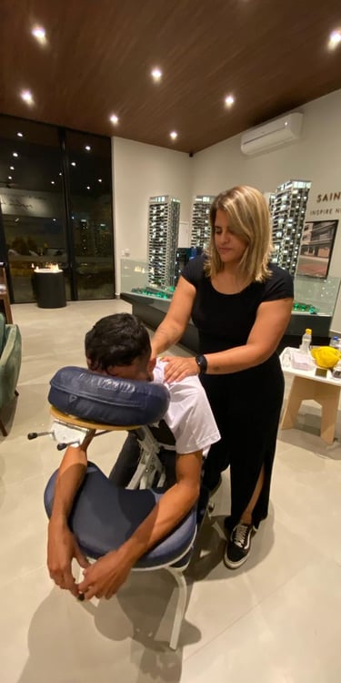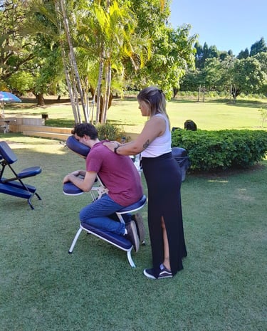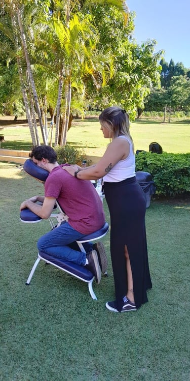 Massagem realizada em uma cadeira específica, com duração de 20 min, onde são focadas as regiões das costas, braços e cabeça, aliviando os pontos de tensão e estresse do dia a dia. Realizada geralmente em eventos empresariais, corporativos e sociais.